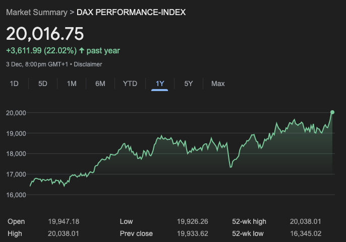Germany’s DAX Index hits 20,000 points in historic gains, despite economic woes